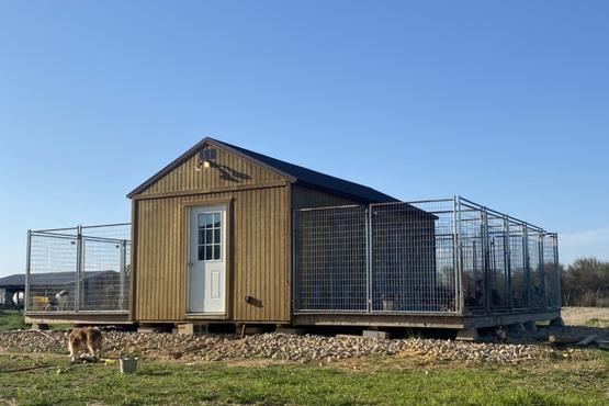 We have a 12'x24' portable building, purchased new in 2015, that is insulated and covered with cement board, topped with FRP for easy cleaning and essentially waterproof. There are two doors, one on either end of the building. The flooring is silver coin G-flooring. There is a hole in the G-flooring in two of the inside pens and I have heavy-duty black stall mats in those pens. Heavy duty Gun Dog Doors doggy doors lead to ten 5'x10' outside pens on grey trex deck boards. I used windscreen as shade on top of the pens but recently took it down to replace and have not gotten to it yet. New AC/Heater unit was put in this summer. It has several electrical outlets inside for easy access for heat lamps, blowers, radios, etc. Also has an outside electrical plug. You arrange and pay to have it moved. Will come with the decks and the pens. *It cannot be moved until dogs are sold or moved out!*